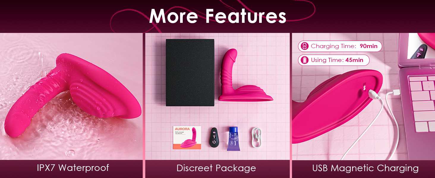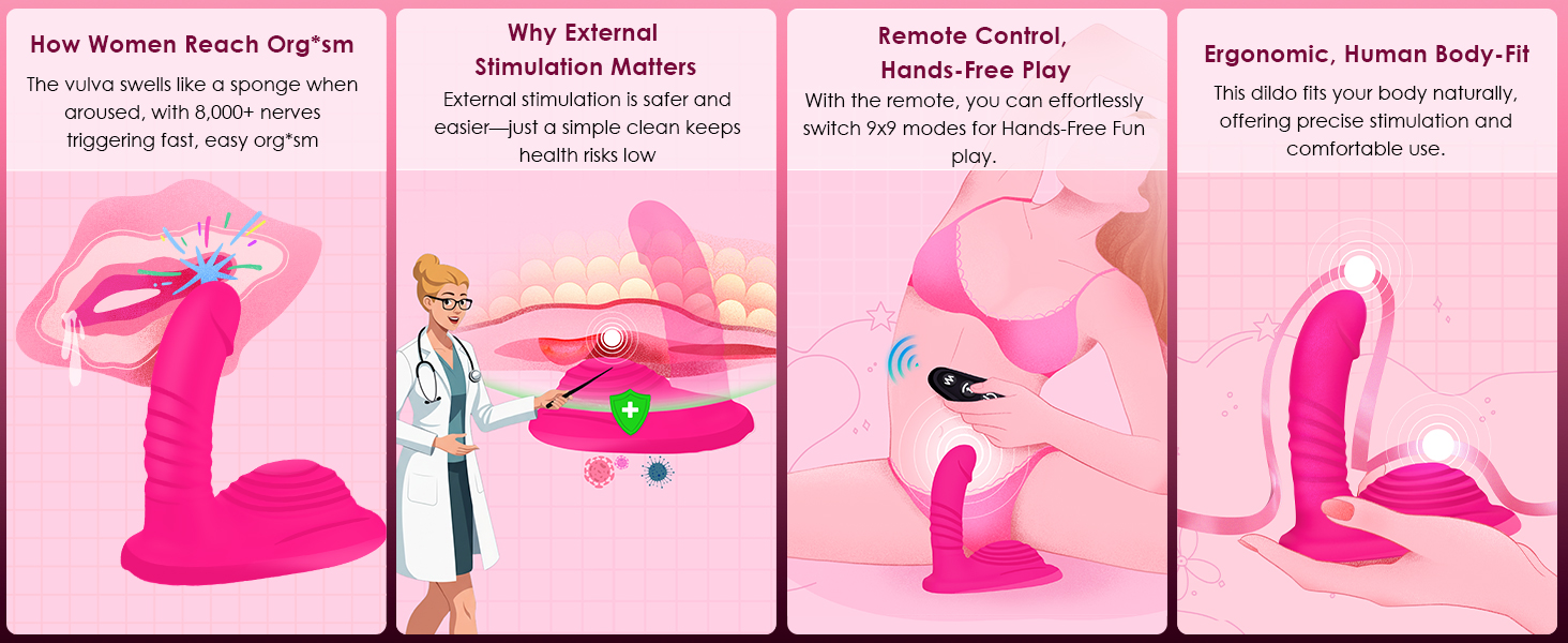 The dual stimulation of internal and external sensations by friction sex toys – riding and rubbing – leads to a more intense feeling of pleasure. The friction vibrator stimulates the clitoris and perineum, while the thrusting dildo specifically stimulates sensitive internal areas such as the G-spot, U-spot, and prostate.